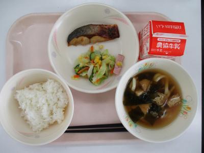 ~ごはん、ふくらぎのマーマレード焼き、キャベツとハムのサラダ、わかめうどん汁、牛乳~