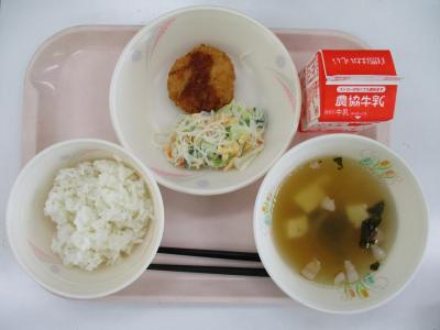 ~ごはん、チキンカツ、たまごと春雨のスープ、小松菜のスープ、牛乳~