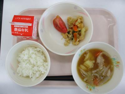 ~ごはん、卵と野菜のピリ辛炒め、カットトマト、肉じゃが、牛乳~