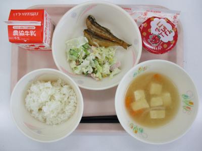 ~ごはん、はたはたから揚げ、カリフラワーサラダ、みそ汁、牛乳、いちごゼリー~