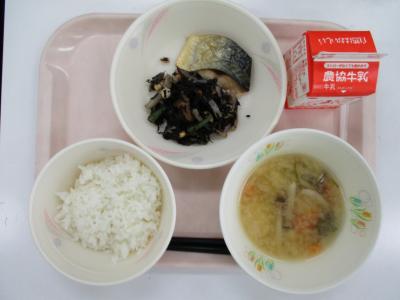 ~ごはん、さばの塩焼き、ひじきの炒め煮、めった汁、牛乳~