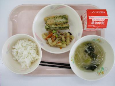 ~ごはん、ちくわの磯辺揚げ、じゃがいもの豚ひき炒め、切干大根のみそ汁、牛乳~
