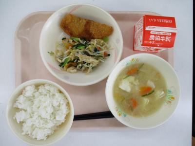 ~ごはん、かつおフライ、油揚げと小松菜のあえもの、めった汁、牛乳~