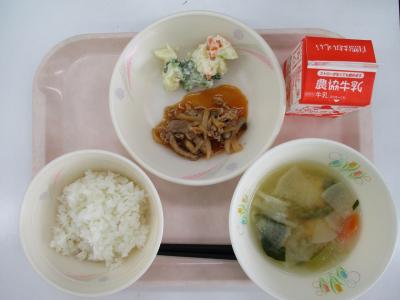 ~ごはん、ポークチャップ、ポテトサラダ、あつあげのみそ汁、牛乳~