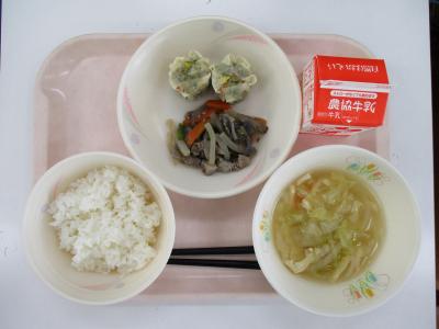 ~ごはん、野菜しゅうまい、五目きんぴら、キャベツのみそ汁、牛乳~