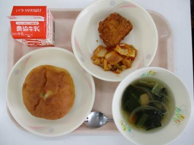 ~豆パン、チキンカツ、しめじとトマトのラタトゥイユ、ウインナーと野菜のスープ、牛乳~