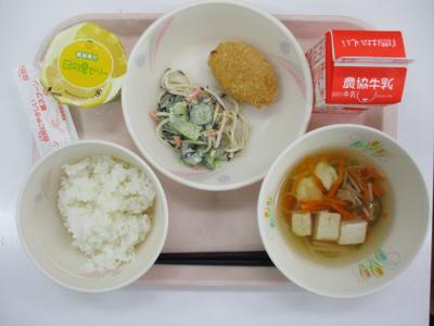 ~ごはん、コーンコロッケ、ひじきのサラダスパゲッティ、とうふのすまし汁、牛乳、日向夏ゼリー~