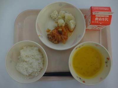 ~ごはん、鶏肉のトマトソース、粉ふきいも、かぼちゃのポタージュ、牛乳~
