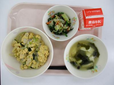 ~麦飯、親子丼、おかか和え、とうふのみそ汁、牛乳~