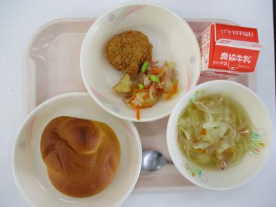 ~キャロットパン、チキンカツ、ジャーマンポテト、キャベツとマカロニのスープ、牛乳~