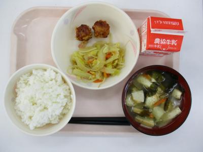 ~ごはん、揚げしゅうまい、野菜炒め、若竹汁、牛乳~