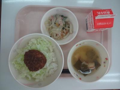 ~(麦飯)、ソースカツどん、野菜炒め、じゃがいものみそ汁、牛乳~