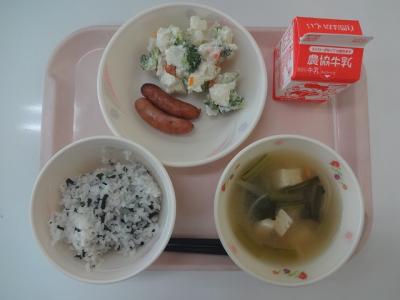 ~わかめごはん、ウインナー、ポテトサラダ、とうふのみそ汁、牛乳~