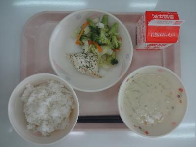 ~ごはん、鶏肉のマヨネーズ焼き、グリーンサラダ、コーンポタージュ、牛乳~