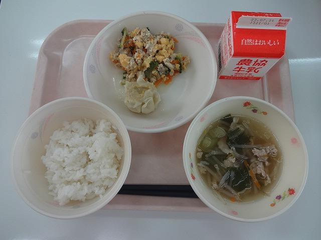 ~ごはん、ゴーヤチャンプルー、コーンシュウマイ、春雨スープ、牛乳~