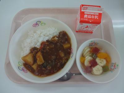 ~麦飯、夏野菜カレー、フルーツのゼリー和え、牛乳~