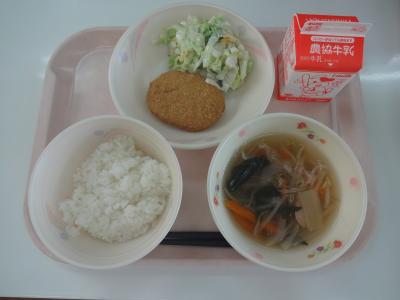 ~ごはん、豚肉コロッケ、カリフラワーサラダ、ウインナーと野菜のスープ、牛乳~