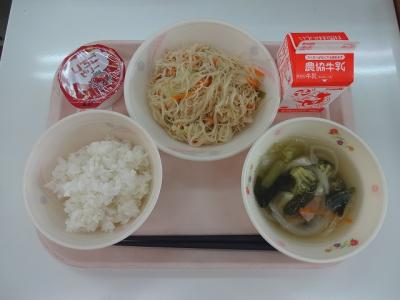 ~ごはん、ビーフン炒め、野菜スープ、牛乳、いちごゼリー~