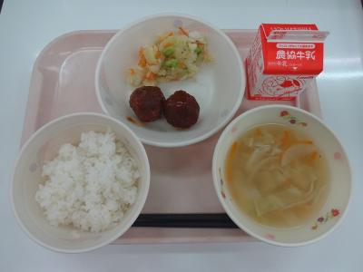~ごはん、肉団子トマトソース、ジャーマンポテト、野菜とマカロニのスープ、牛乳~