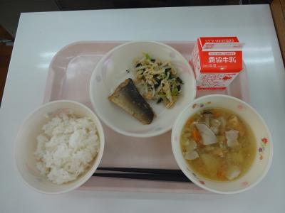 ~ごはん、さばのスタミナ焼き、油揚げと小松菜の和え物、具だくさん汁、牛乳~