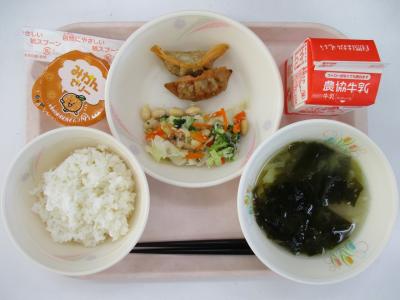 ~ごはん、揚げギョウザ、じゃこと大豆のサラダ、わかめのみそ汁、牛乳、みかんゼリー~
