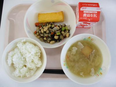 ~ごはん、たまごやき、五目煮豆、具だくさんみそ汁、牛乳~
