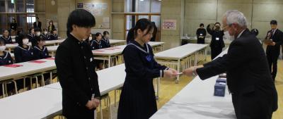 受験を控えた3年生に農事組合法人「能登やまびこ」の方から、今年も合格祈願米が入ったお守りを頂きました。