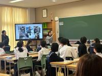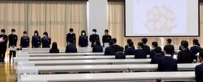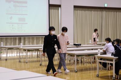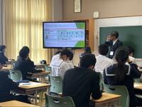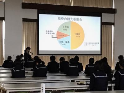 2年生の学年生徒会を中心に、中能登中学校で大切にしている中能登ルーティンや中能登スタンダードについて説明を聞き、動画等も交えた学校紹介の様子を真剣に聞いていました。