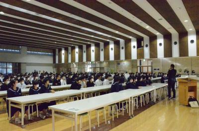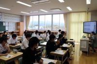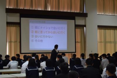 非行被害防止講座では、中能登教育事務所より、山崎指導主事を講師としてお迎えし、情報モラルやネットリテラシー等についてお話いただきました。生徒たちの家庭でのネット利用状況を確認できたり、具体的な事例を通して、こんなときはどうするか、ということを考える場面では、子供たちの考えを共有できたりすることができました。さらに、生徒同士で意見交換する様子から、ネットトラブル等に巻き込まれないように、子供たちなりに考えながら利用しようとしていることや、適切な使い方について考えようとしている姿が見られました。危険だからネットを使わせない、という考え方から、危険をいかに回避し、自分で正しい判断ができるようにしていくか、そのためには使いながら学んでいくことが大切なのだと思います。ご家庭でもぜひ、インターネット等の使い方について、お話しながら家族内のルールが共有されるとよいかと思います。