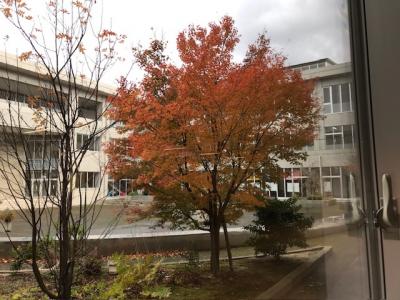 校庭の紅葉が、とてもきれいなグラデーションに包まれていました。中庭は、お天気の良い日しかお昼休みの解放はできませんが、草木の変化を感じてちょっと一息するのもいいものです。