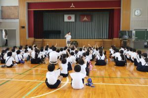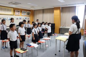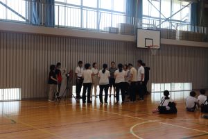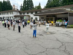 二日目の朝は、他校といっしょに朝の集いです。ラジオ体操や学校紹介、ジャンケン列車もしました。
