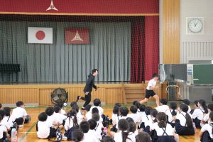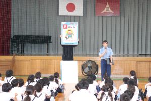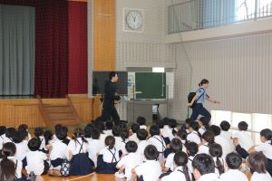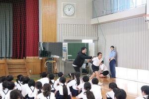 警察署の方からは、校外での不審者への対応について「いかのおすし」の確認と不審者から逃げるロールプレイングのお手本を見せてもらいました。