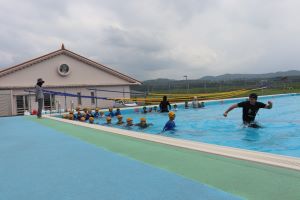 一人ずつ救命胴衣を着て、水に入って浮く練習もしました。