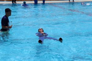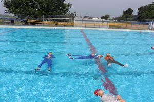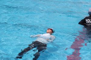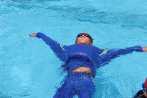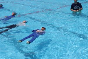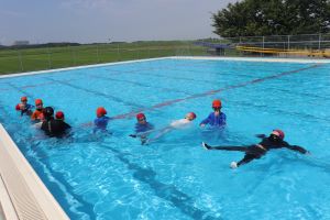 長く浮くために、衣服に空気をためて浮く練習です。