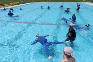 まずは、水着の上に衣服を着てプールに入り歩いてみます。
