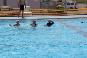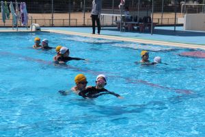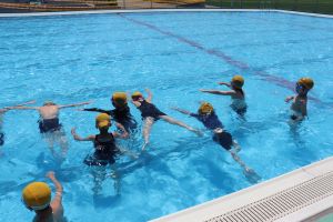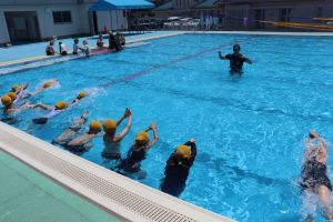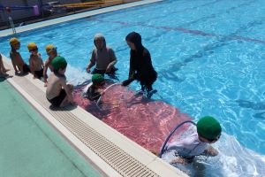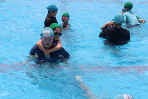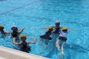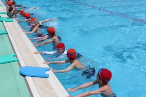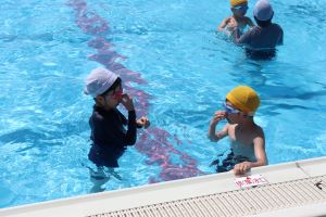 最初のプールでは、怖がらずにプールに入り、水に慣れることが大事です。