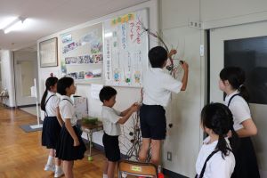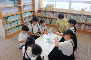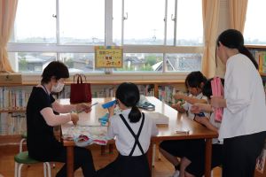 今月は、図書室で七夕かざりを作る取り組みも行っているので、一緒に作ったり、教えてもらったりしています。
