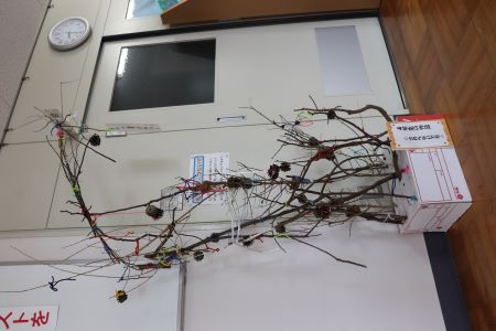 中島神社で集めた枝やまつぼっくりをむすんでつないで作成したようです。