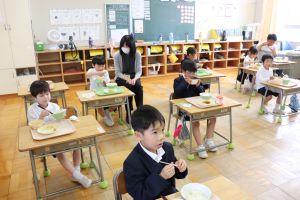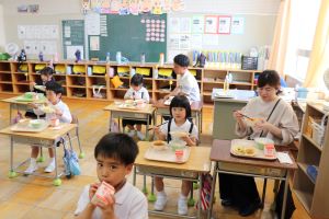 給食の配膳後、1年生の教室で試食をしてもらいました。