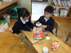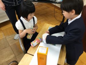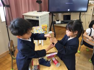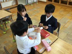 1年生は、その日お家からもってきたたくさんの箱やつつで「いろいろなかたち」の学習をしました。