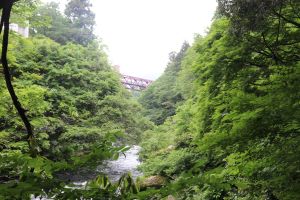 次は、鶴仙渓です。こおろぎ橋からあやとり橋までガイドさんの説明を聞きながら、歩きました。