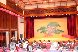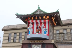 山中座にもどるとちょうどお昼の時間となり、からくり時計の音が流れてきました。