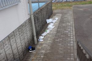 コンクリートのすき間からはえている草をぬいたり、道の隅にたまっている土を集めたりしました。