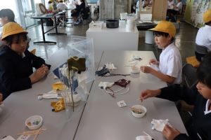 説明後、染色体験です。白い布や巾着を染めるのですが、ゴムで巻いたところや結んだところは白く残ります。