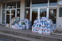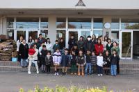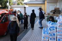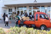中島地区は、子どもたちや保護者の方が学校玄関前に集まり、集めてきたものを車から降ろします。