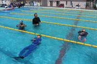 3.4年生は、衣服を着て入水。救命胴衣をつけたり、ペットボトルをもったりして、浮く練習をしました。