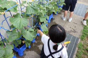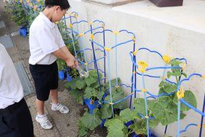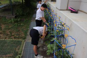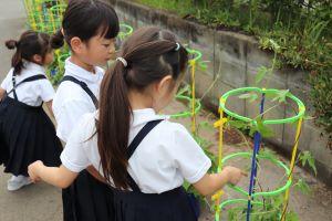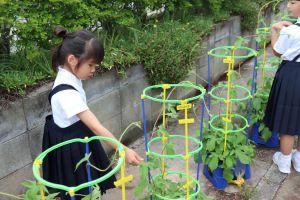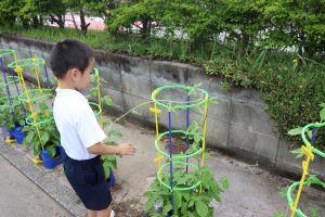2年生は、毎朝忘れずに鉢植えの野菜と畑のさつまいもに水をあげています。
