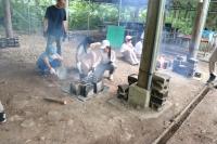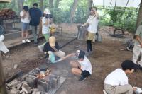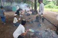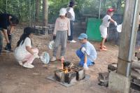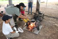 ちょうど、野外炊飯の途中で、火を付けてご飯を炊いているところでした。