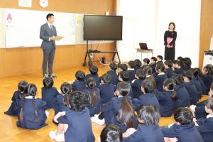 各地区ごとの元気な挨拶を聞いた後、丙午の年のことや3学期の過ごし方、読書の取組について話をしました。