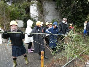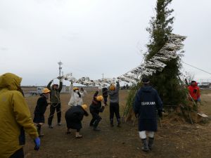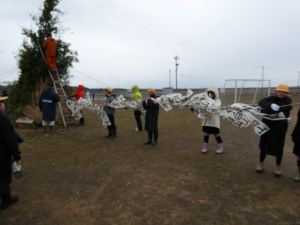 最後は、6年生が縄につけてくれた書初めを櫓にとりつけます。